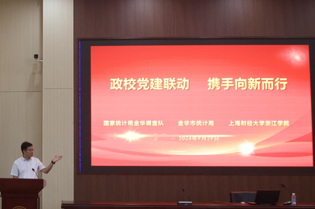 学院党委副书记何志强代表学院党委向市调查队、市统计局的各位领导、嘉宾表示热烈欢迎,并向在座的师生致以亲切问候。他强调,此次主题党日活动与第15届中国统计开放日和中华人民共和国成立75周年的重要时刻相契合,上财浙院始终聚焦高水平应用型人才培养,为统计系与市调查队和市统计局的政校党建联建提供了天然土壤。政校双方通过搭建党建联建平台,以项目攻坚为纽带,共同开展了金华市专业市场和商业综合体入库纳统、金华市共同富裕基础数据库建设、金华市社情民意调查、浙江小微企业十年生存发展情况调研等统计领域的前沿课题研究,以及正在进行的大语言模型在统计实务方面的应用研究,积极推动了统计理论与实践的创新发展,更孕育了统计学子创新实践的广阔天地。