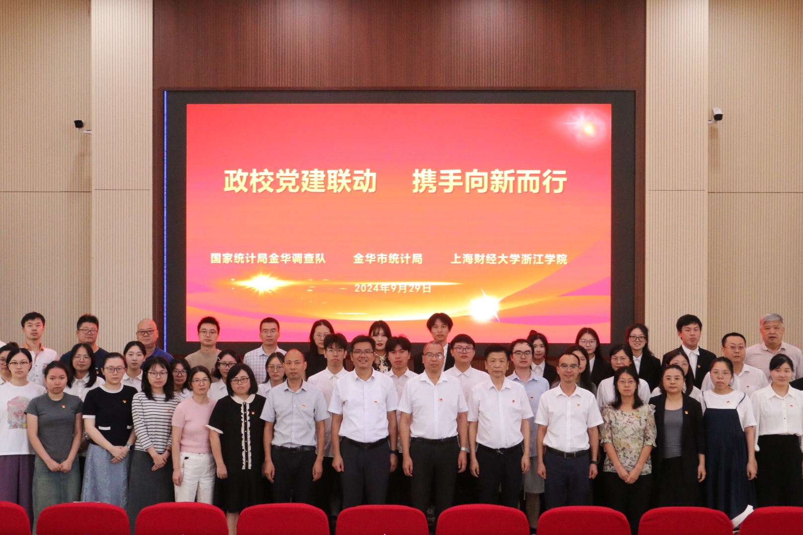 9月29日,学院统计系联合国家统计局金华调查队、金华市统计局,在学院120报告厅开展了“政校党建联动 携手向新而行”主题党日活动。此次活动不仅是一次党建联建的重要实践,也是对前期政校党建联建成果的精彩展示和深化拓展,更是学院积极推进“一融双高”建设与统计系践行“双学双融”发展理念的生动实践。活动中,还举行了新生“开学第一课”系列活动启动仪式。市调查队党组成员、副队长张国民、楼涛及纪检组长徐玉飞,市统计局党组成员、社会经济调查队队长赵奇峰,上海财经大学教务处副处长吴纯杰,以及学院党委副书记何志强、学院党委委员、组织部部长张正亮等出席活动。此外,来自市调查队和市统计局的党员、干部代表,以及半岛电子全体新生和师生党员等共计200余人也参与了此次主题党日活动。