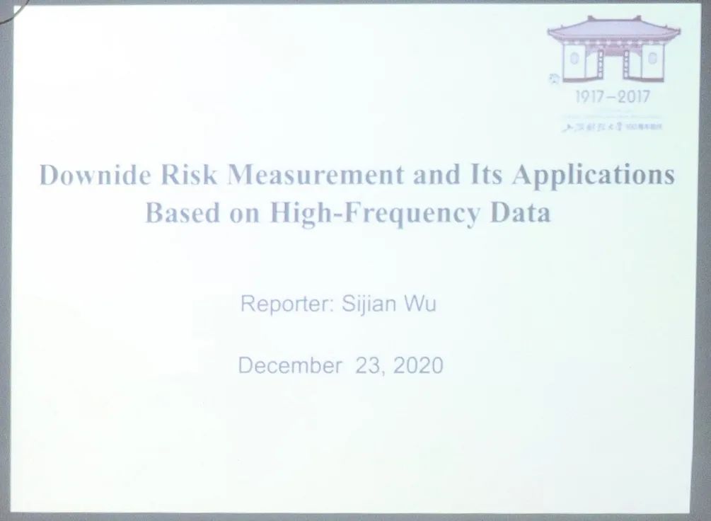 为让我系学子更加了解金融风险方向,新的风险衡量方法以及股市的分布特征和相关性分析,拓展知识为统计分析打下坚定的基础,于12月23日下午6:00在6-102教室举行了《基于高频数据的下行风险度量研究及其应用》的讲座。